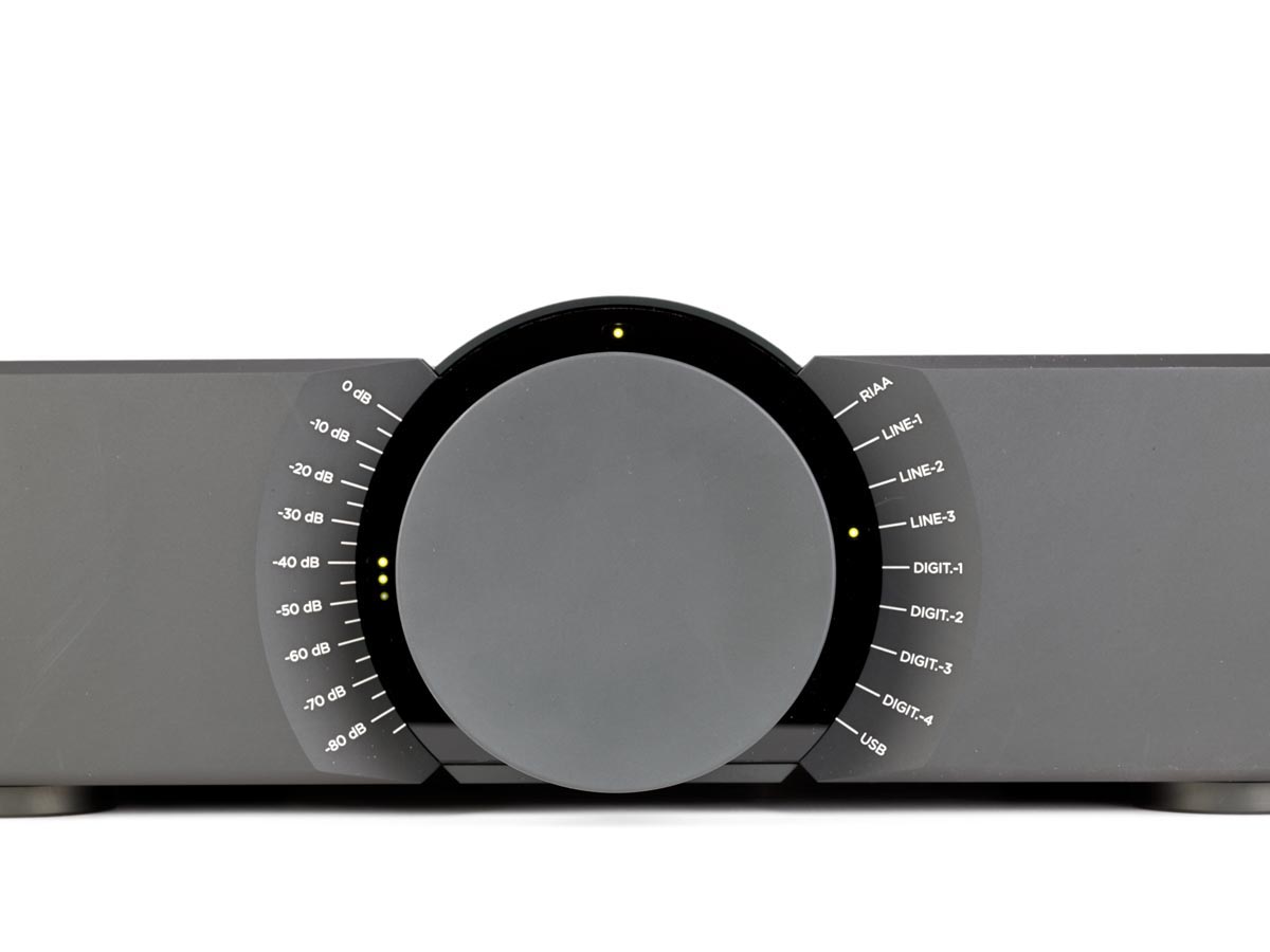 Fresh out of the box, the U-380 looked like a sculptural work of audio art and weighed in at just under 17 kilos. On the very top shelf of my rack, where the amplifier belonged not least because of the CNC-milled brand name proudly running the full depth of the housing, the U-380 looked like something straight out of the Batcave or Darth Vader’s private listening room. Despite it having numerous inputs, a powerful DAC section, and an adjustable phono stage, my first glance at it didn’t reveal any displays designed to provide information on the relevant operating mode. Its only controls consist of three push buttons and one rather prominent large rotary knob (actually a dial) given pride of place right in the middle of the front panel. That knob is surrounded by a ring of white LEDs — and there you have it: the display. The rotary encoder is the input device. Users can switch between level control, balance, source selection, gain, and phono input impedance by either pressing the buttons briefly or holding them down for longer. This all works very well and you feel a bit like you’re in a luxury sedan with iDrive or Command Controller at your fingertips.