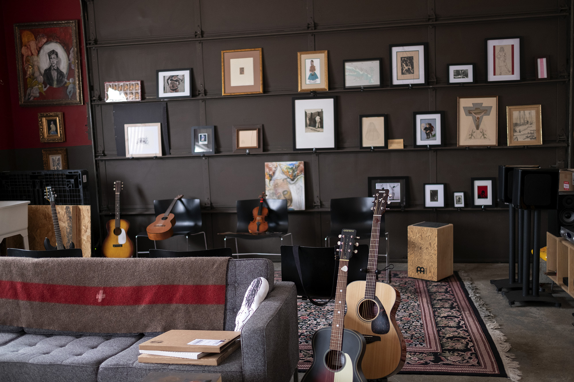 An oversized garage door makes up the Barn listening area rear wall which I use as a place to display art. A few are mine, most aren’t. The set of six Handkerchief Chairs, some holding instruments, were designed by Lella and Massimo Vignelli for Knoll in 1985 (they’re comfortable too).