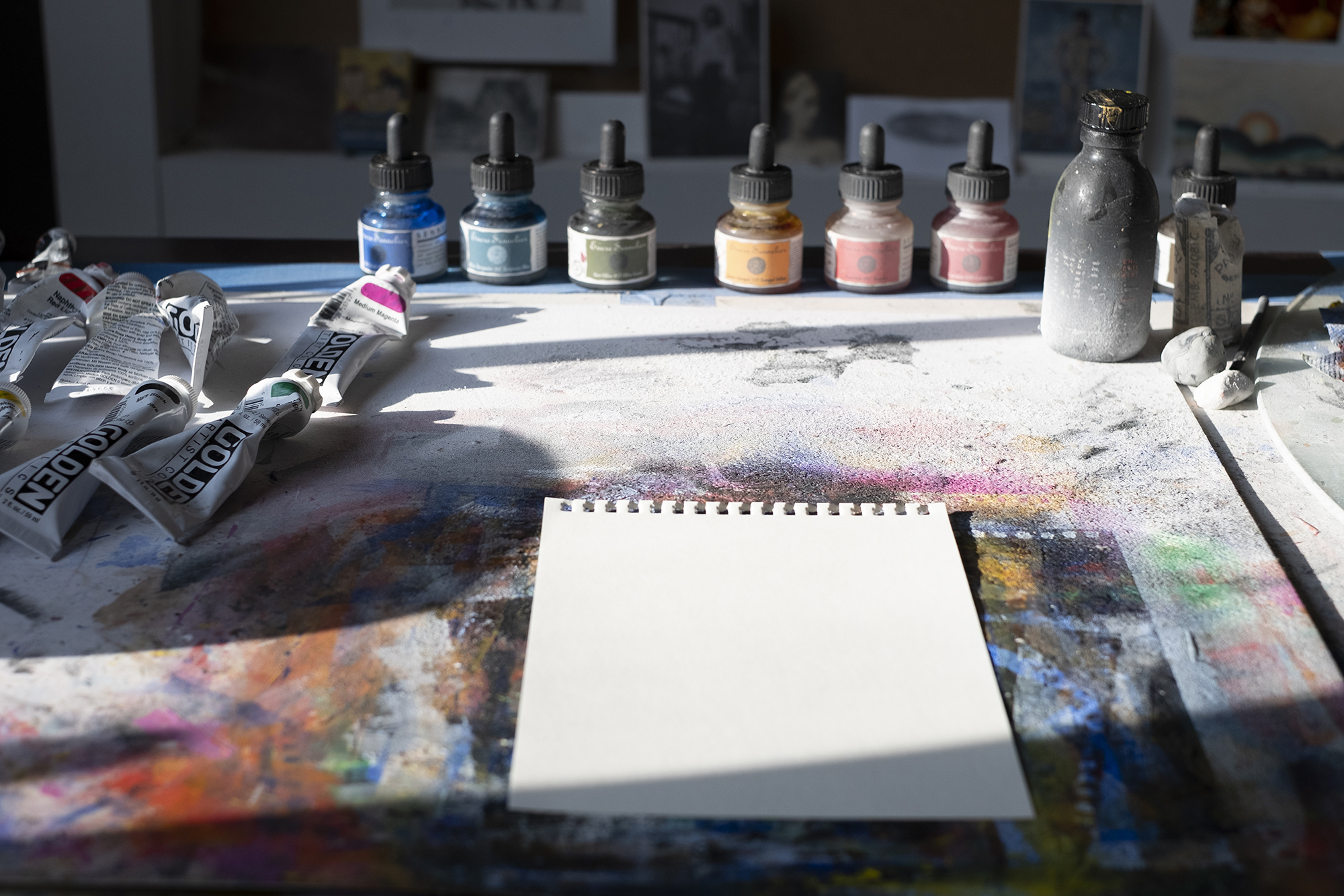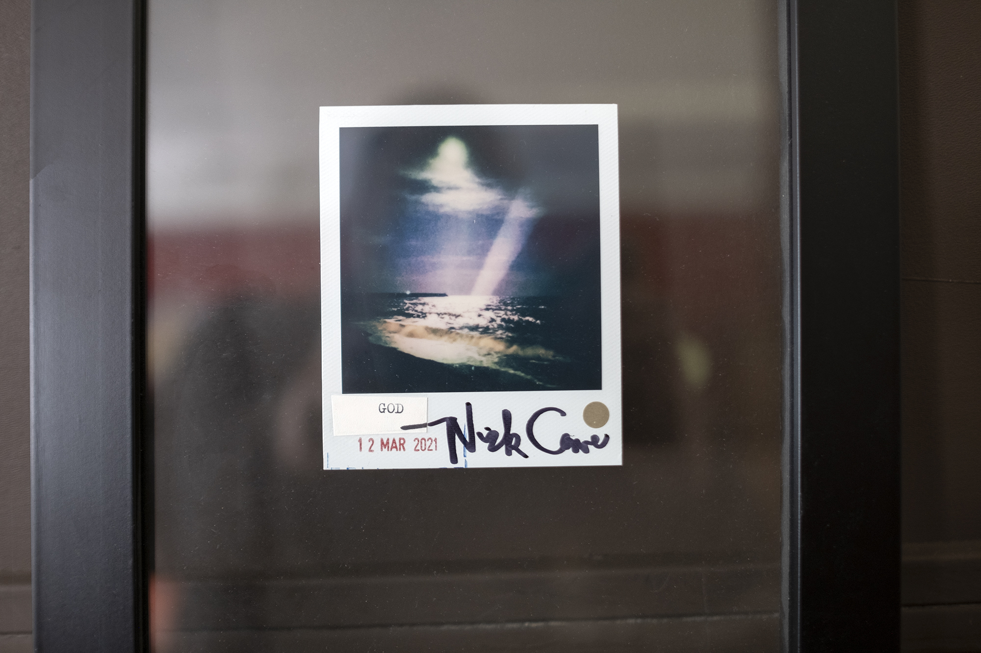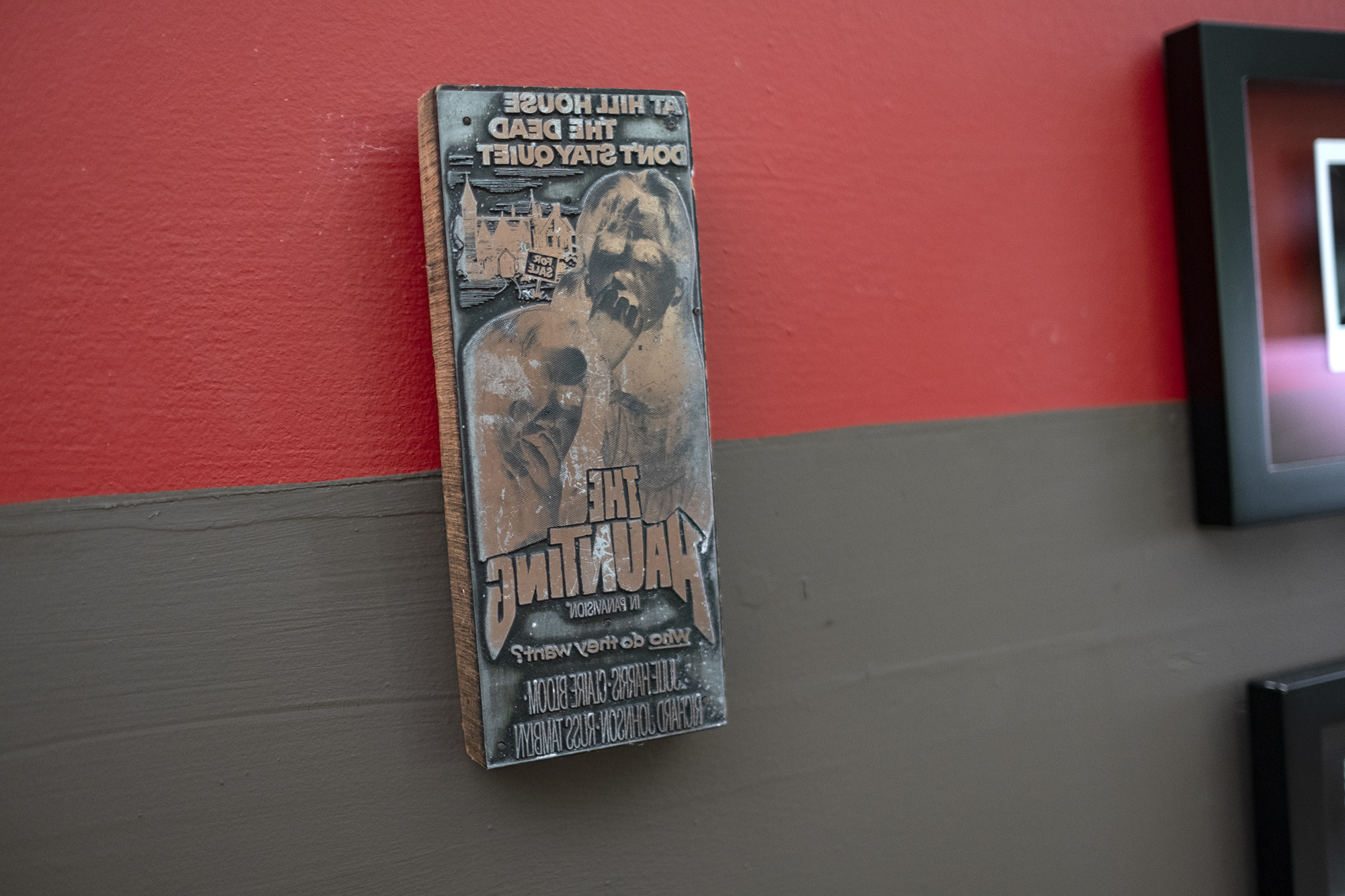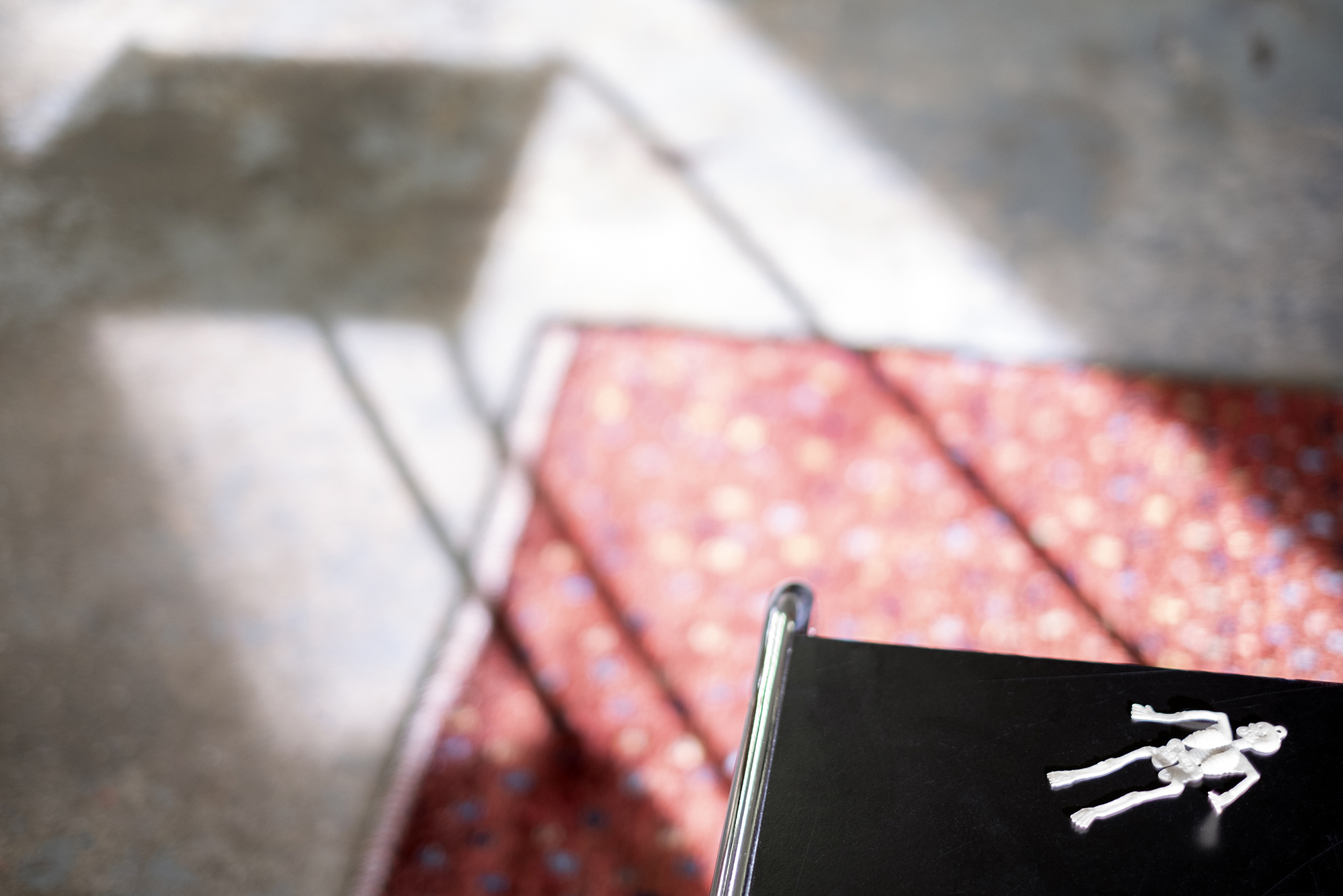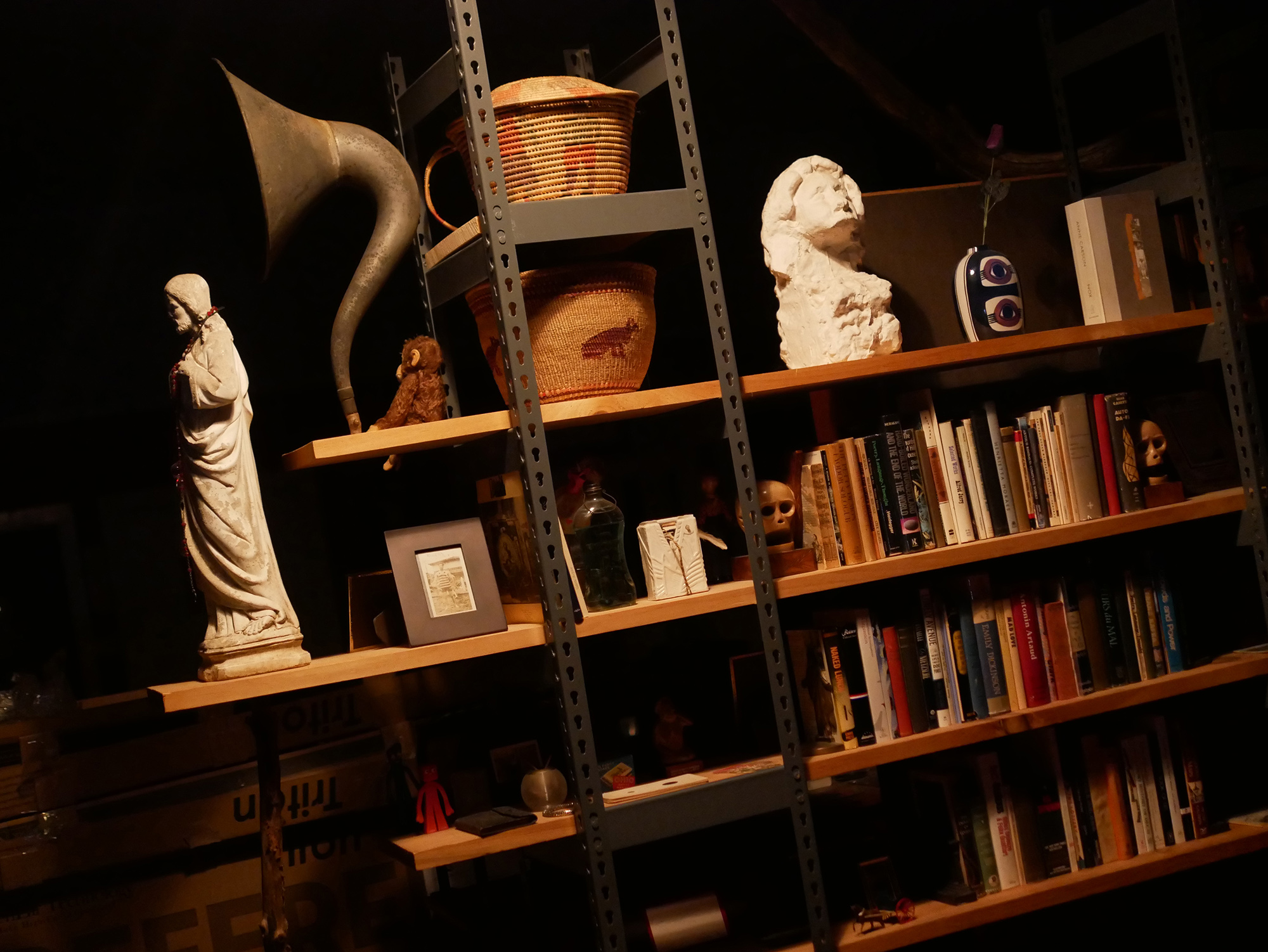 The desk, designed by Eric Pfeiffer for Offi, hold a pair of ADAM A3X active speakers. Art includes a Joseph Beuys felt postcard, photo of Marcel Duchamp, Duchamp’s Eskimo Tongue Depressor (from S.M.S.), woodblock print from “Les minutes de sable mémorial”, Alfred Jarry ([Paris]: Editio[n] du Mercure de Fra[n]ce, C. Renaudie, 1894), Kurt Schwitters Anna Blume (1919), carved lion head, signed Polaroid by Hideki Tonomura, signed print by Emi Anrakuji (from e hakagi), and The Haunting printers block (I Slept in Hill House).