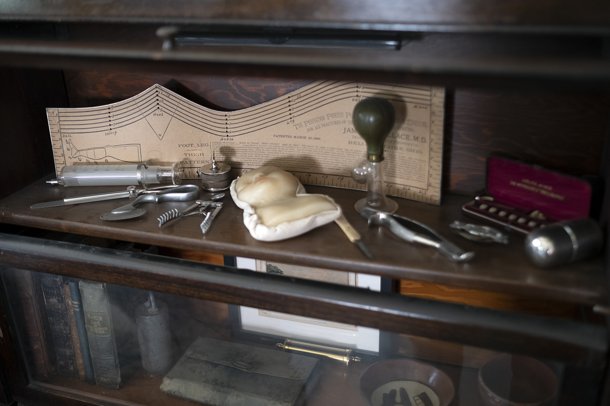 Part of a barrister bookcase turned curio cabinet. Top shelf: medical antiques.