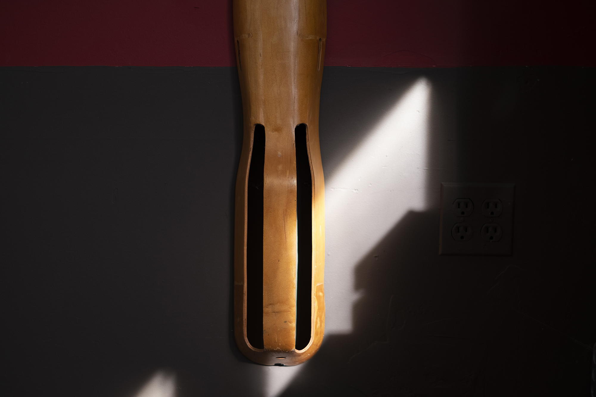 Detail of the Eames Leg Splint (c.1942) that hangs on the Barn’s front wall. A contract with the U.S. Navy to mass produce these splints kick started the company.