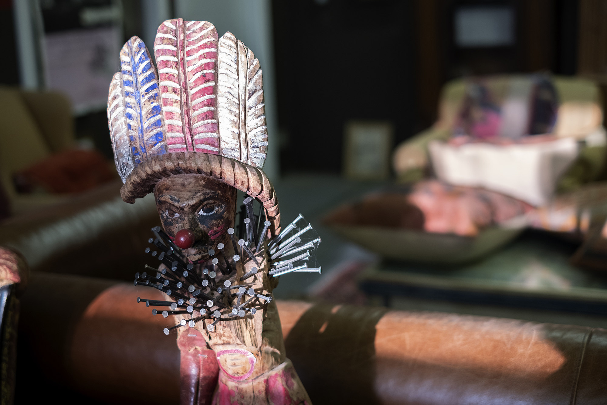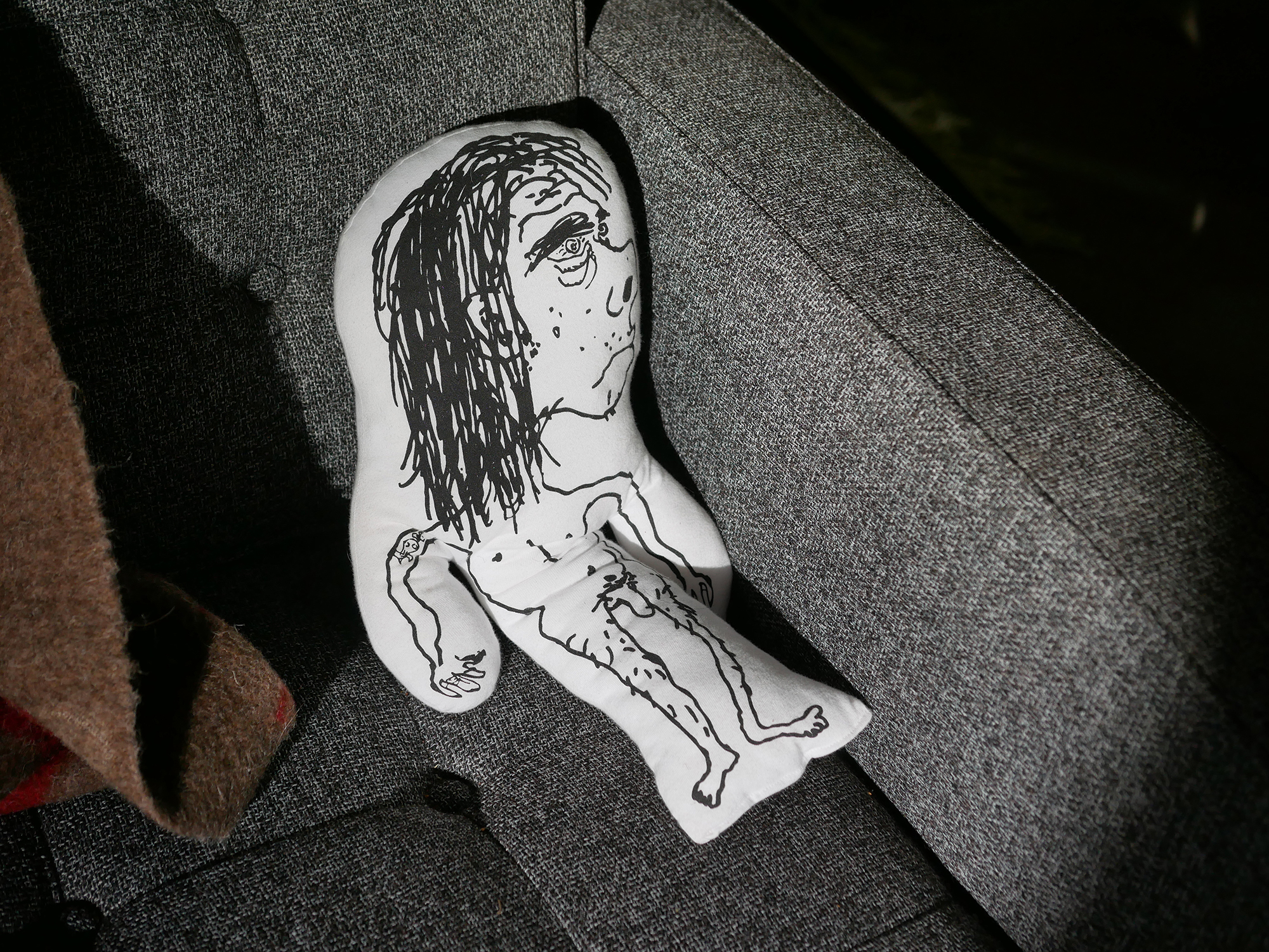 A corner of the listening area couch occupied by a Nick Cave Plush Doll.