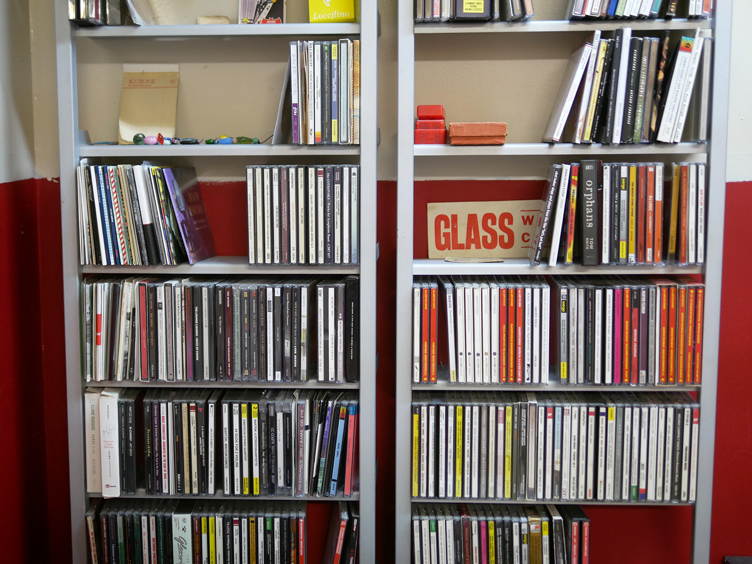 CDs hide in a back room. “GLASS With Care” sign from a Western Electric 212e tube box (gift from Komuro).