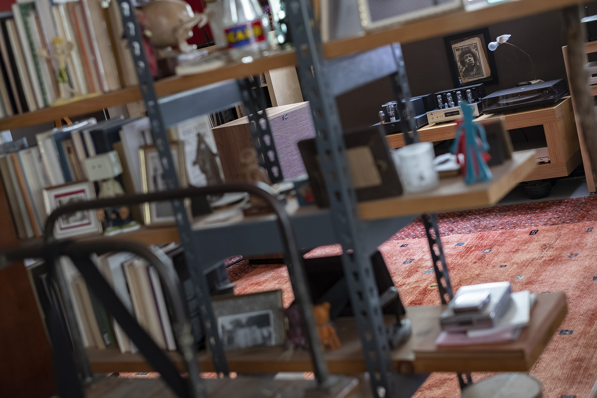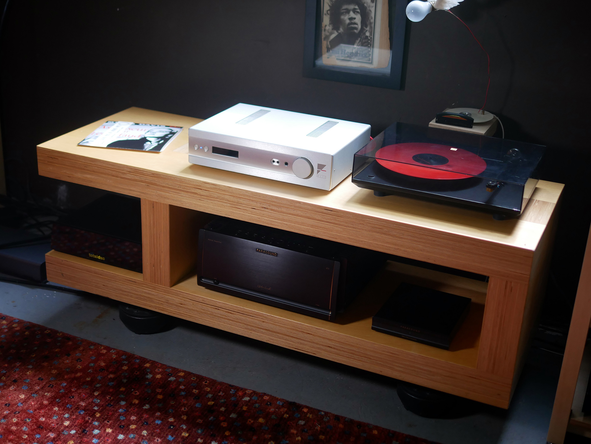 I designed my equipment rack with the help of Box Furniture who made it. It’s called the Fallen A and it sits on footers by Ligno Labs. You can see a piece of the winged Lucellino light by Ingo Maurer.