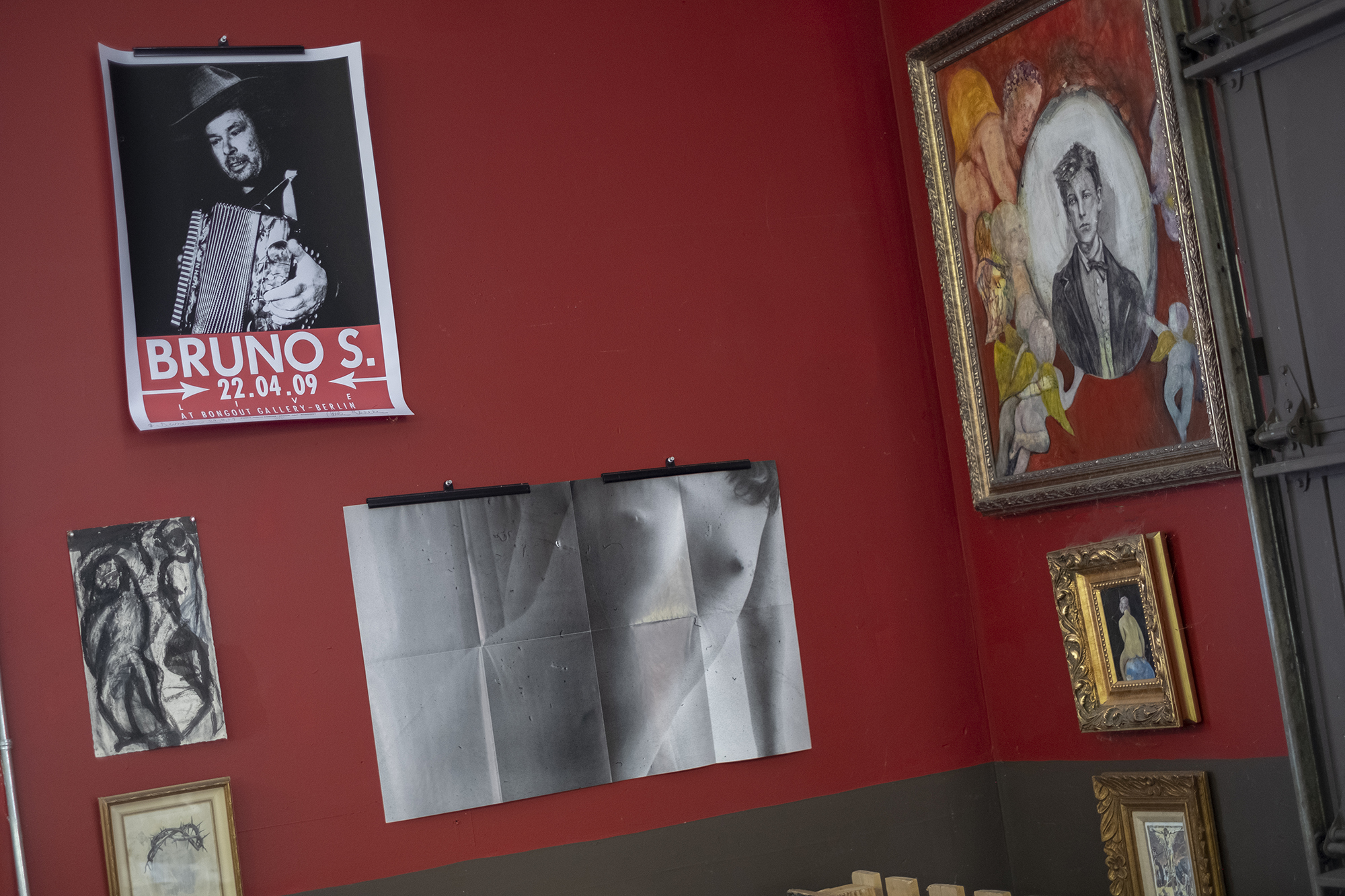 Another Barn wall with art. The poster up top is signed by Bruno S., star of the screen in a number of films by Werner Herzog. The lovely black and white photo/poster is by Daisuke Yokota from his book Taratine (2015). The other works are by me.