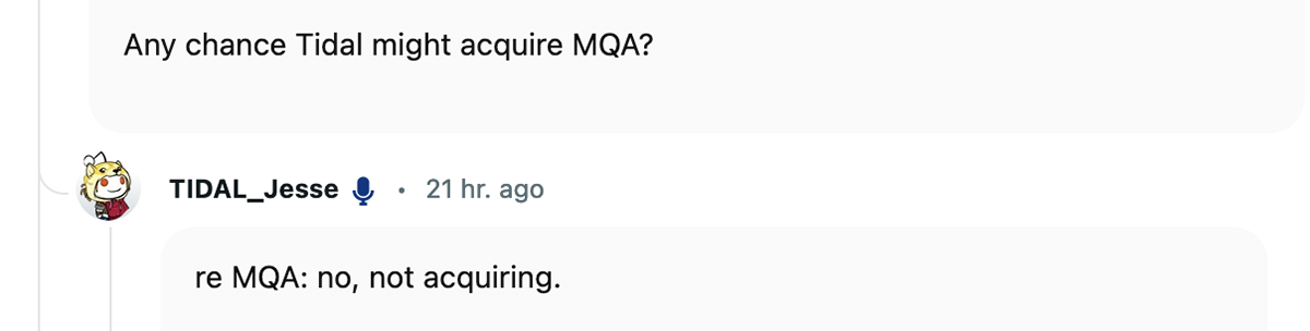 So many questions about MQA and hi-resolution audio. I hope we don’t spend all of our time on audio format details, but it’s an AMA and you’re asking.