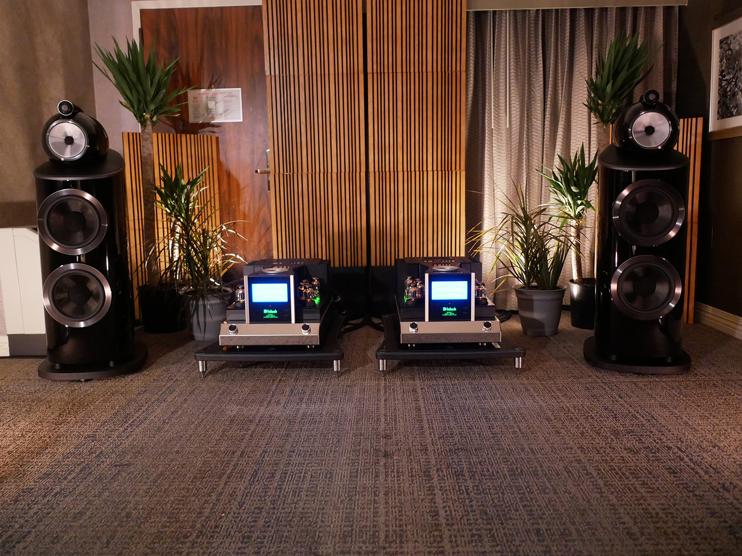 Pictured up top are the massive 180 lb. a piece McIntosh MC901 Monoblock Amplifiers ($35,000/pair) that combine a 300 Watt vacuum tube amplifier and 600 Watt solid state amplifier on one chassis. Think bi-amp.