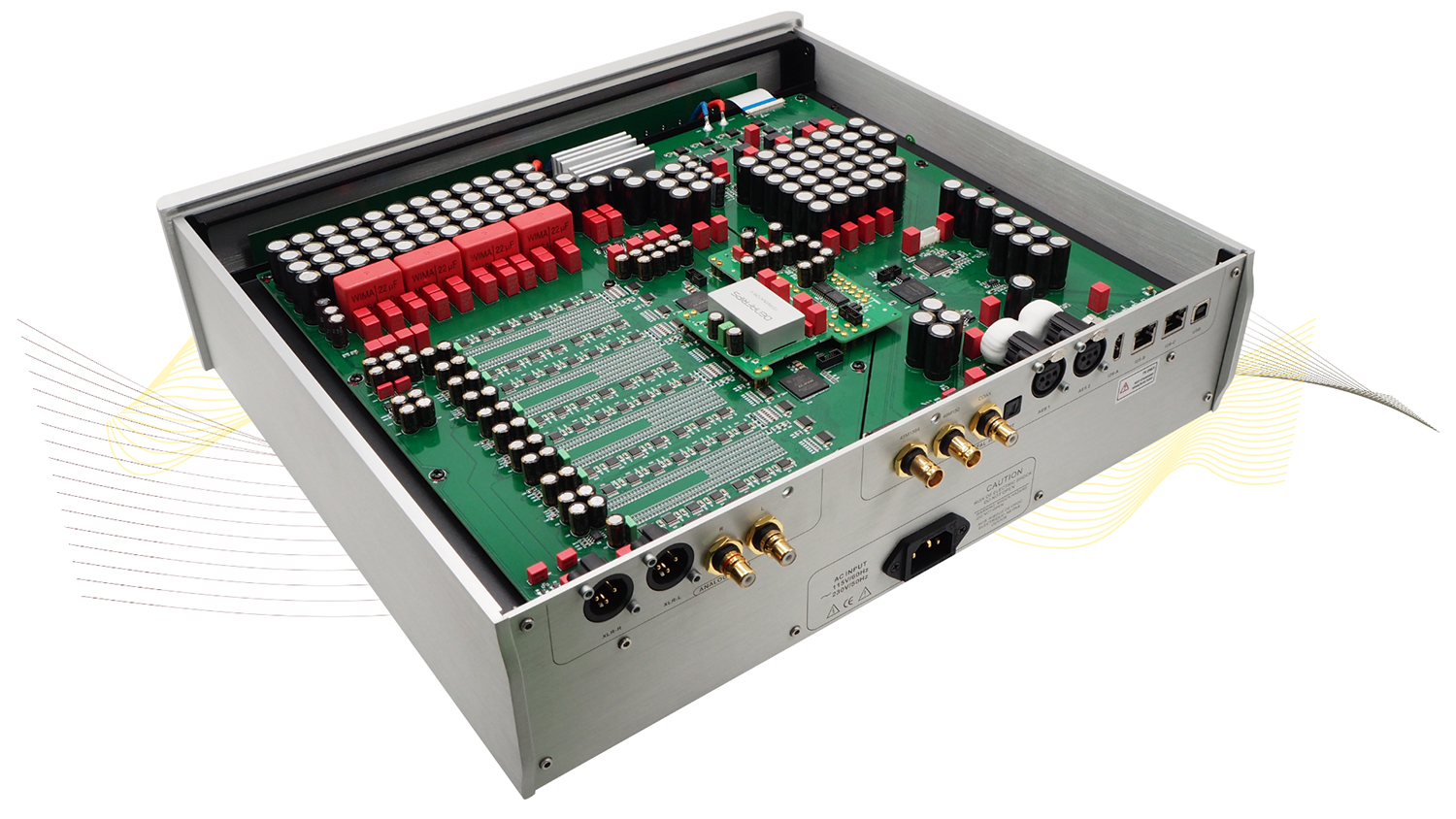 The Digital Processing Board and R-2R ladder network arrays are completely isolated on separate boards, while the oven-controlled crystal oscillators sit dead center on the DAC board for super short signal paths.