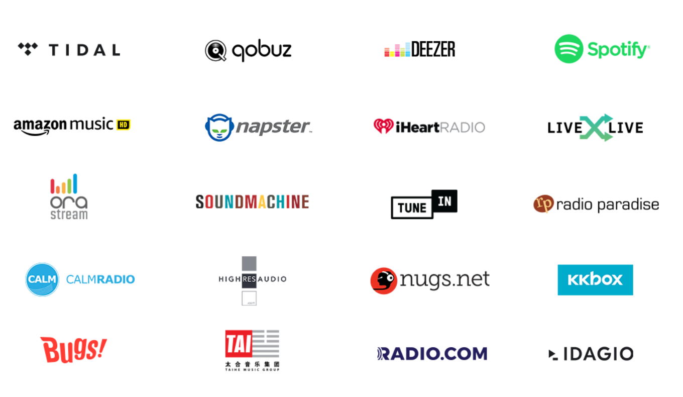 Spotify, Amazon Music HD, TIDAL, Deezer , Qobuz, HighResAudio (VAULT Required), Napster, KKBox, Bugs, Taihe Music ZONE, SoundMachine, IDAGIO, OraStream