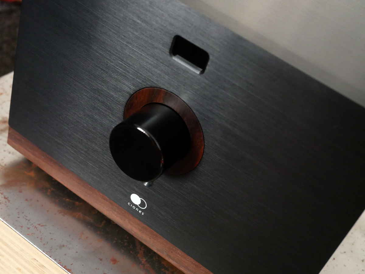 The 25iRX’s 190mm(W) X 170mm(D) X 130mm (H) aluminum chassis sits on a nice slab of wood which sits on three feet and there’s a matching wood inlay around the volume control knob which also acts as input selector when depressed. The included remote performs these same functions.