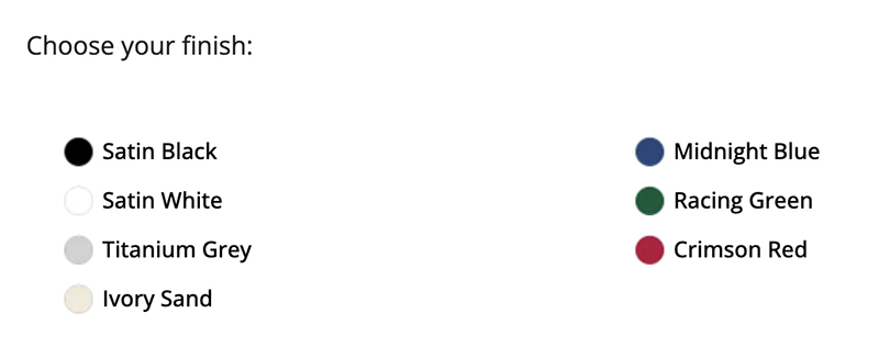 Finishes: Satin Blac, Satin Whit, Titanium Grey, Ivory Sand, Midnight Blue, Racing Green, Crimson Red