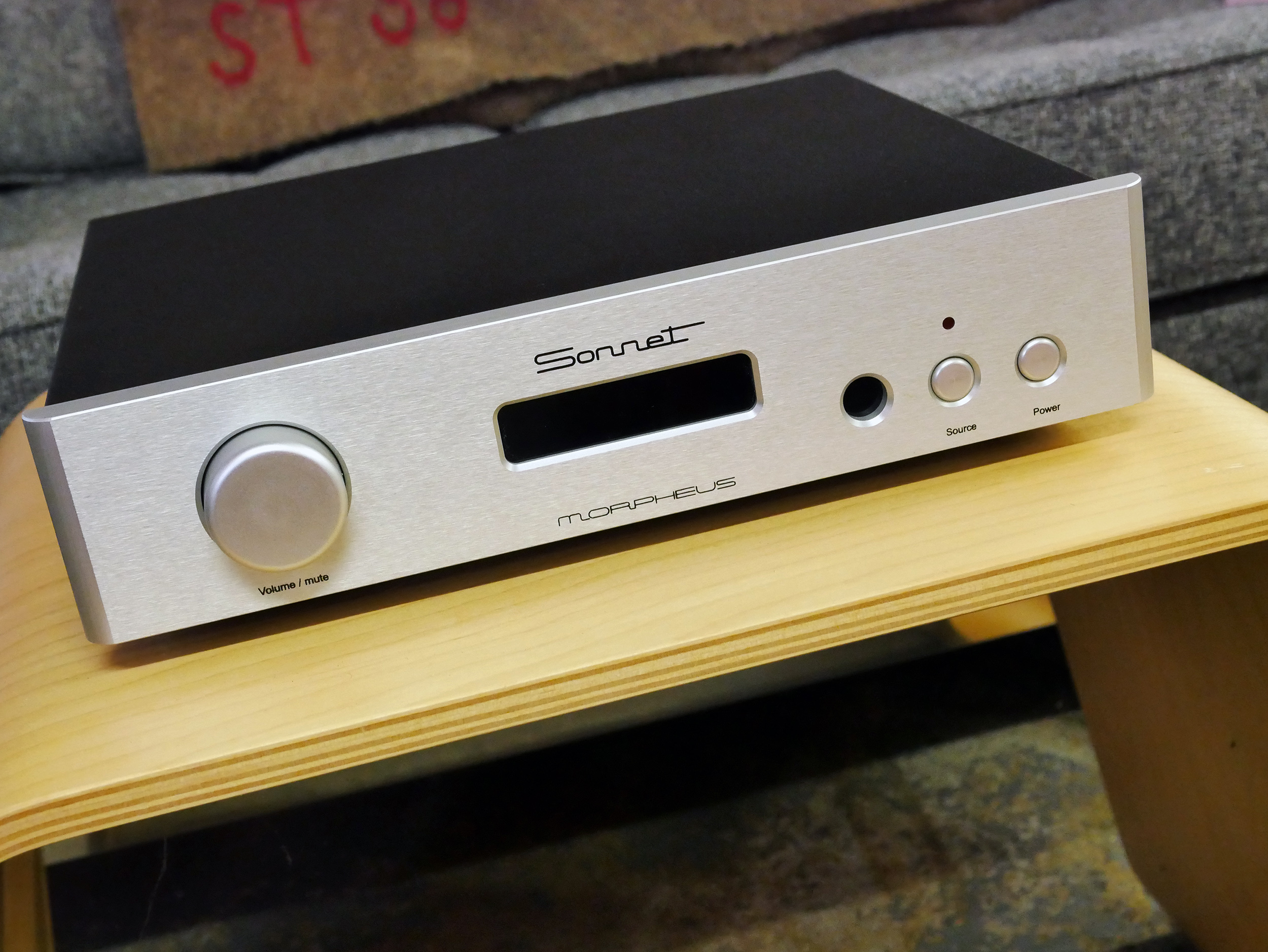 As you can see, Morpheus’ front panel is all business with a Volume/Mute knob, a display, and two buttons for source selection and power. The included remote offers these same functions. That aluminum faceplate comes in silver or black.