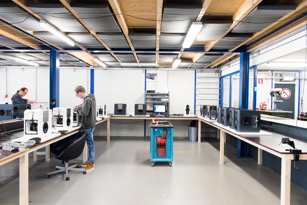 This is precisely where Kii Audio comes thundering in — a bolt out of the blue to stop us in our tracks. You already guessed this twist was coming, didn’t you? The creative minds at the innovative fledgling company have come up with a clever trick that’s not only able to limit excitation but takes one step further to completely prevent all of its most harmful effects. The compact THREE loudspeaker emits sound toward the listening position over a tweeter and a mid-range, while the bass drivers have been positioned on the sides and back of the housing. Altogether, each stylish and colorful active loudspeaker features four identical 16.5-centimeter bass drivers as well as the pair on the front. And thanks to its bundled dispersion, the spatial effect of all this can be disregarded. Each chassis is driven by its own 250-watt amplifier section, which receives its signals directly from a discrete D/A converter — so six drivers, six amplifiers, and six DACs. There’s also a circuit board with a central brain in the form of a DSP as well as an A/D converter: You can control the THREE over its single XLR connection either with AES/EBU or an analog input. Given the speaker’s compactness, it’s easy to imagine just how tightly all the equipment and electronics inside the closed housing are packed in.