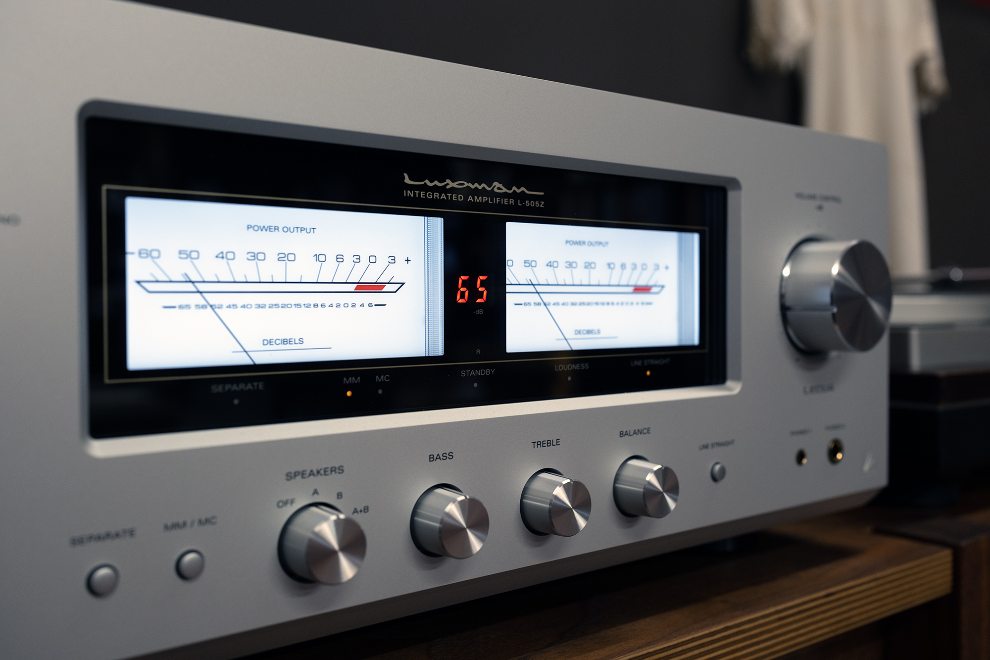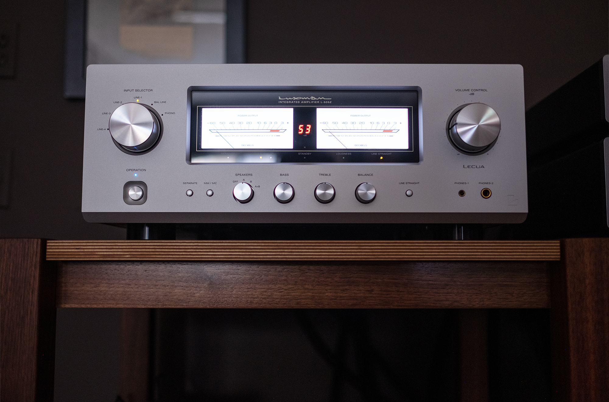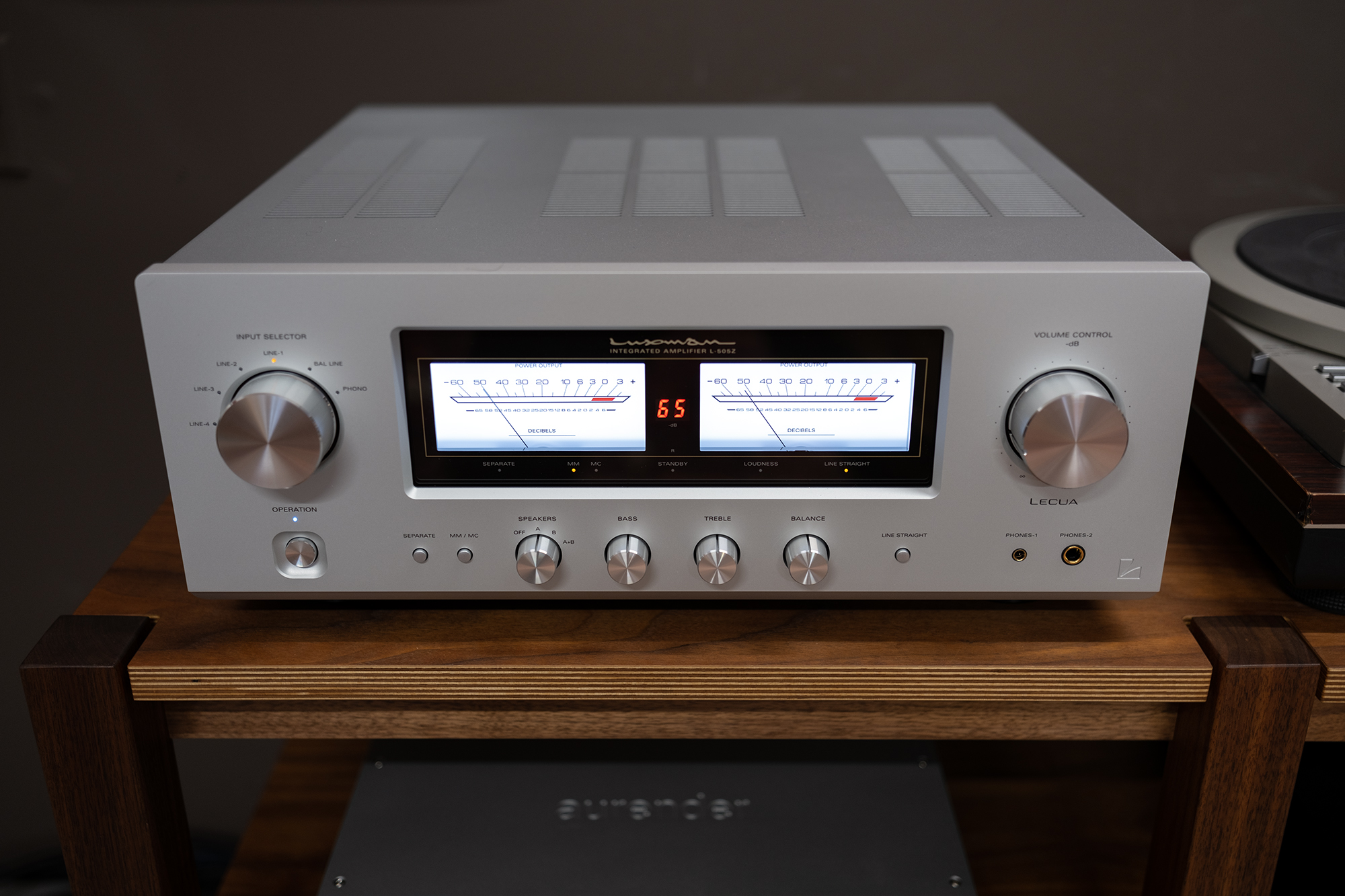 The L-505Z houses a number of upgrades from the L-505uXII it replaced including an improved moving magnet/moving coil phono preamp, 12-volt triggers, parallel headphone output jacks including a “Pentaconn” balanced type, and 7-segment white LED volume level-VU meter display that can be turned on and off via the included remote.